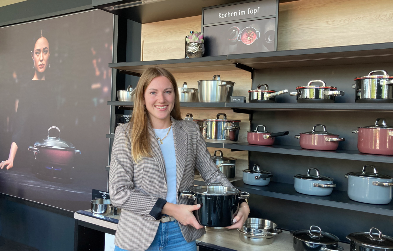Wie essentiell das Thema Nachhaltigkeit für die WMF ist, zeigt die tägliche Arbeit von Rebecca Bäurle. „Kein Unternehmen kommt daran heute noch vorbei, allerdings ist der Umgang mit dieser Herausforderung unterschiedlich“, so Bäurle.  Schon während des Studiums arbeitete Rebecca Bäurle bereits elf Monate als Werksstudentin bei der WMF und schrieb auch ihre Abschlussarbeit in dem Unternehmen, die dann auch prompt als beste Bachelorarbeit von der WMF mit einem Preis honoriert wurde. Heute ist Rebecca Bäurle mit den Herausforderungen der Zeit konfrontiert. Einen Tag in der Woche verbringt sie am WMF-Standort in Riedlingen und verantwortet dort das Produktmanagement für die hochpreisigen Töpfe und Pfannen im sogenannten Premiumsegment. Permanente Umbrüche im Markt kennzeichnen ihre Arbeit. Sorgte die Pandemie im zweiten Jahr für Rekordumsätze, sind es nun die Inflation und steigende Preise, die wieder Unsicherheit erzeugen. „Wir müssen permanent den Markt analysieren und die Produkte anpassen. Doch das Thema Nachhaltigkeit bleibt, es geht um die langlebige Qualität der Töpfe, Energieverbrauch beim Kochen und nachhaltige Werkstoffe“.