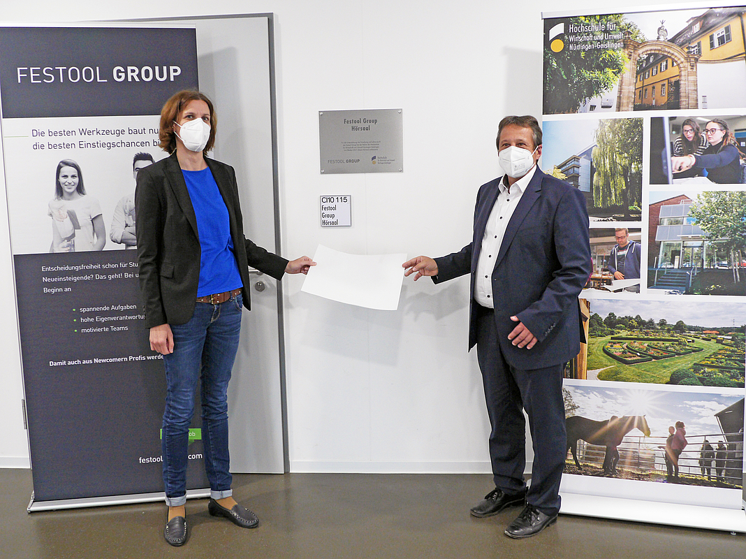Ein mit der HfWU unterzeichneter Sponsoring-Vertrag umfasst unter anderem die Benennung eines Hörsaals im neuen Nürtinger Hochschulgebäude in der Sigmaringer Straße. Im Rahmen eines kleinen feierlichen Akts erhielt die Räumlichkeit im Beisein von HfWU-Rektor Prof. Dr. Andreas Frey und Juliane Niemann, bei Festool Leiterin des Personalreferats und Personalmarketings, den Namen „Festool Group Hörsaal“.