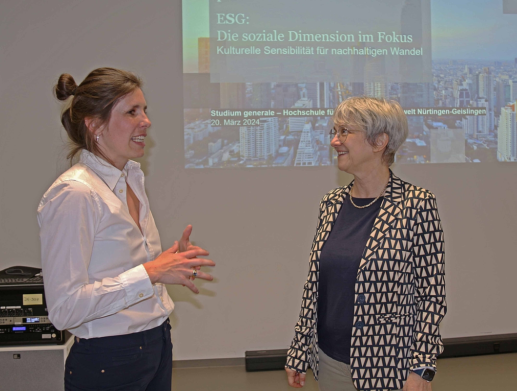 Marie-Christine Döscher im Gespräch mit der Gleichstellungsbeauftragten der HfWU, Prof. Dr. Barbara Wild. (Foto: HfWU)