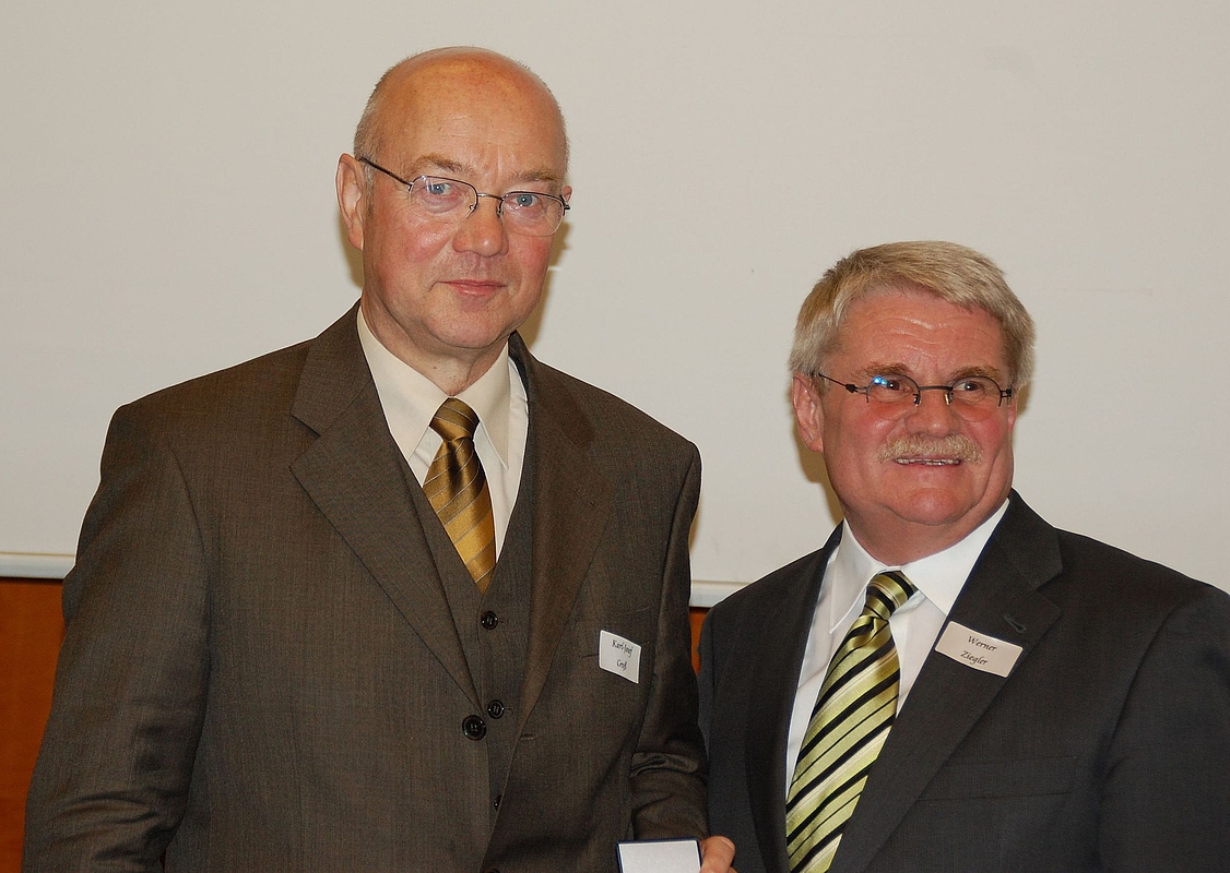 HfWU-Rektor Prof. Dr. Werner Ziegler bei der Übergabe der Ehrenmedaille an Dr. Karl-Josef Groß (links).