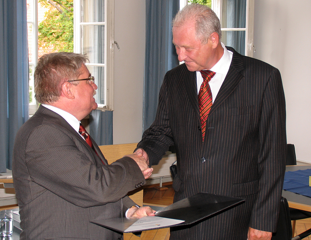 Gerhard Bachthaler hat sich sehr engagiert mit der IHK Bezirkskammer Esslingen-Nürtingen mit dem Räumesponsoring der HfWU auseinandergesetzt und „Klinken geputzt“. Er war der Initiator dieses Sponsorings. Es wurden mehrere hundert Infobriefe verschickt, telefonisch nachgehakt und persönliche Gespräche mit potenziellen Sponsoren geführt. Alles ehrenamtlich, versteht sich! Die Sponsoren-Akquise lief über zwei Jahre. Inzwischen hängen an 15 Räumen der HfWU Schilder von Sponsoren, die der Hochschule zusätzliche Finanzmittel zur Verfügung stellen. Der Einsatz von Gerhard Bachthaler wurde bei der feierlichen Ernennung auch vom IHK-Präsidenten Wolfgang Kiesel besonders gewürdigt, der das uneigennützige Engagement Bachthalers und die daraus resultierende Verbindung von Wirtschaft und Wissenschaft damit hervorhob.