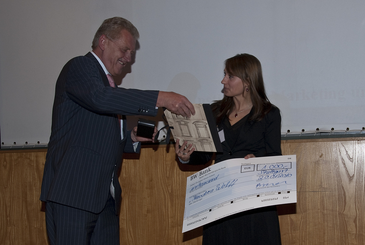 Der stark besuchte Neujahrsempfang am 20. Januar 2010 des Landesverbandes Freier Immobilien- und Wohnungsunternehmen Baden-Württemberg e.V. (LFW) im Haus der Wirtschaft in Stuttgart war der feierliche Rahmen zur Verleihung des vom LFW gestifteten und mit 1000 Euro dotierten, “Bauträger Studienpreis Baden-Württemberg 2010“, den Wirtschaftsminister Ernst Pfister überreichte. Ausgezeichnet wurde die an der Hochschule für Wirtschaft und Umwelt Nürtingen-Geislingen (HfWU) im Studiengang Immobilienwirtschaft von der Preisträgerin Dipl.- Betriebwirtin (FH) Feodora Sophie Wolff im Wintersemester 2008/09 geschriebene Diplomarbeit. Thema der von den Geislinger Immobilienwirtschafts-Professoren Dipl. Ing. Andreas Marchtaler und Dr. Gerrit Leopoldsberger betreuten Arbeit war „Die Wirtschaftlichkeit der energetischen Gebäudemodernisierung vor dem Hintergrund der aktuellen rechtlichen Anforderungen am Beispiel eines Mehrfamilienhauses der 60er-Jahre“.