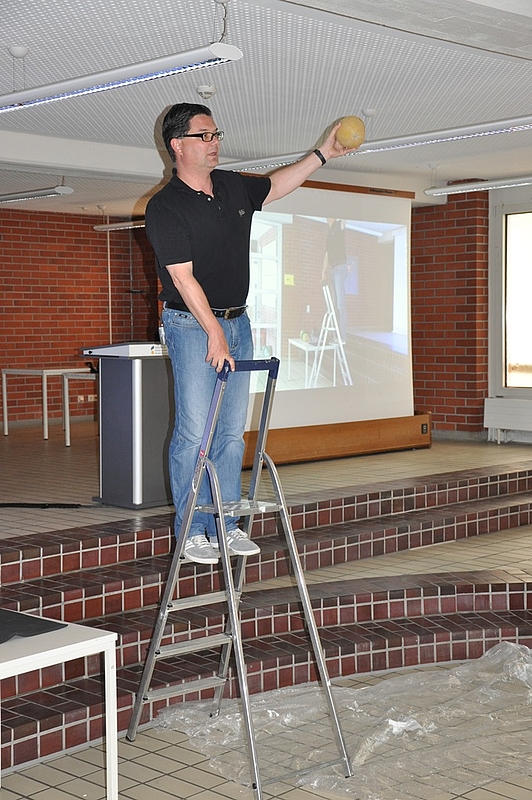 Danach führte er einen Versuch mit einem Ei durch: Der Professor lies es zunächst auf einen Tisch ohne Schaumstoff fallen. Als er es in einem Zentimeter Höhe los ließ, war es unten schon kaputt. Dann aber ließ er das Ei auf einen mit Schaumstoff bedeckten Tisch fallen und da konnte er es noch aus einem Meter Höhe ohne Bedenken fallen lassen. Um die jungen Zuhörer noch einmal darauf aufmerksam zu machen, wie wichtig Helme sind, stieg er auf eine Leiter und ließ aus drei Metern Höhe eine Honigmelone fallen, die zu Boden ging und platzte. Als er eine andere Melone jedoch in einen Helm legte und ebenfalls fallen ließ, kam sie sicher unten an. Buck: „Also denkt dran: Den Helm nicht vergessen!“
