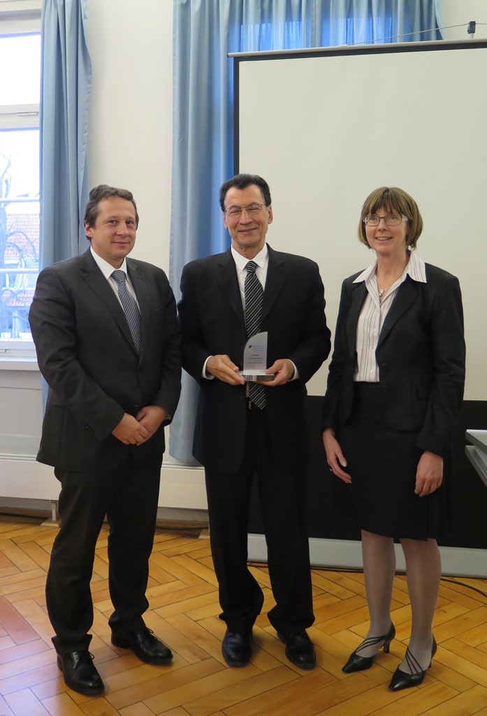 Foto (HfWU/Taigel): Dr. Ali Peyvandi (Mitte), der neue Träger des Award for Outstanding Achievements in International Education der HfWU, neben HfWU-Rektor Prof. Dr. Andreas Frey und Prof. Dr. Iris Ramme.