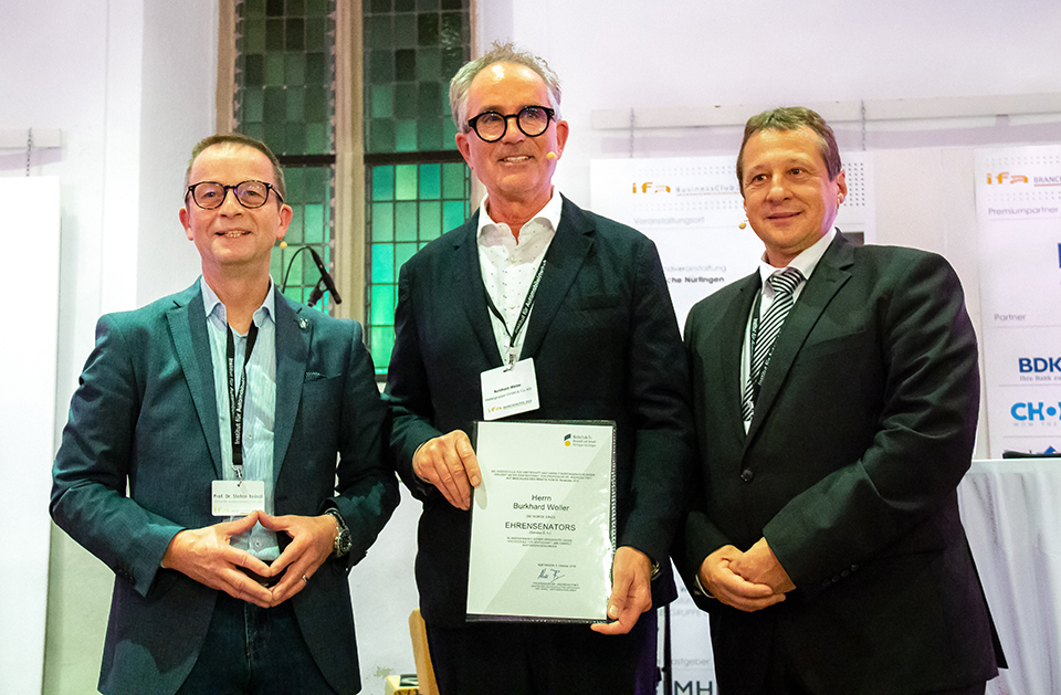 In seinem Lebenslauf nennt Burkhardt Weller nach der Mittleren Reife eine Ausbildung zum Kaufmannsgehilfen als prägende Stationen. Heute ist er als Chef der Weller –Gruppe Herr über 30 Autohäuser mit rund 1800 Mitarbeitern. Er sorgt für einen Jahresumsatz von knapp einer Milliarde Euro und war außerdem lange Zeit Verbandsprecher der Toyota-Vertragshändler. Bei allem unternehmerischen Erfolg ist Weller jedoch vor allem durch seine soziale Ader geprägt: „Es war ihm immer wichtig, der Allgemeinheit zu dienen und der Gesellschaft etwas zurückzugeben“, so beschreibt ihn der Direktor des IfA-Instituts Professor Dr. Stefan Reindl in seiner Laudatio.