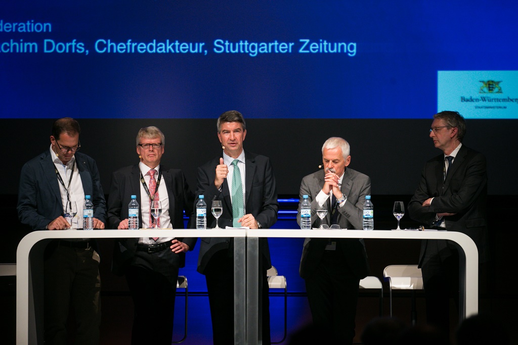 Im Rahmen des Fachforums „Die digitale Revolution der Mobilität: intelligent, vernetzt, autonom“ diskutierte Diez über die Auswirkungen der Digitalisierung auf die Automobilindustrie. Seine Gesprächspartner waren der Vorstandsvorsitzender der ZF Friedrichshafen AG, Dr. Stefan Sommer, Oliver Stark von der Daimler AG sowie Dr.-Ing. Ulrich Eichhorn vom Verband der Automobilindustrie(VDA). Einig waren sich die Teilnehmer darüber, dass die deutschen und insbesondere auch die baden-württembergischen Automobilhersteller und –zulieferer bei diesem Thema gut aufgestellt sind. Bis zum autonomen Fahren müssen nach Ansicht der Experten aber noch einige technische und rechtliche Hürden übersprungen werden.