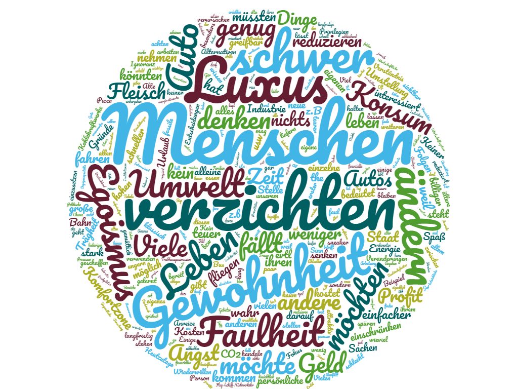 Warum fällt es der Menschheit - also uns - so schwer, unsere Treibhausgasemissionen zu reduzieren? Als „Wordcloud“ die Analyse der Antworten von 500 Studierenden, die am digitalen und interaktiven Zukunftstag teilnahmen.