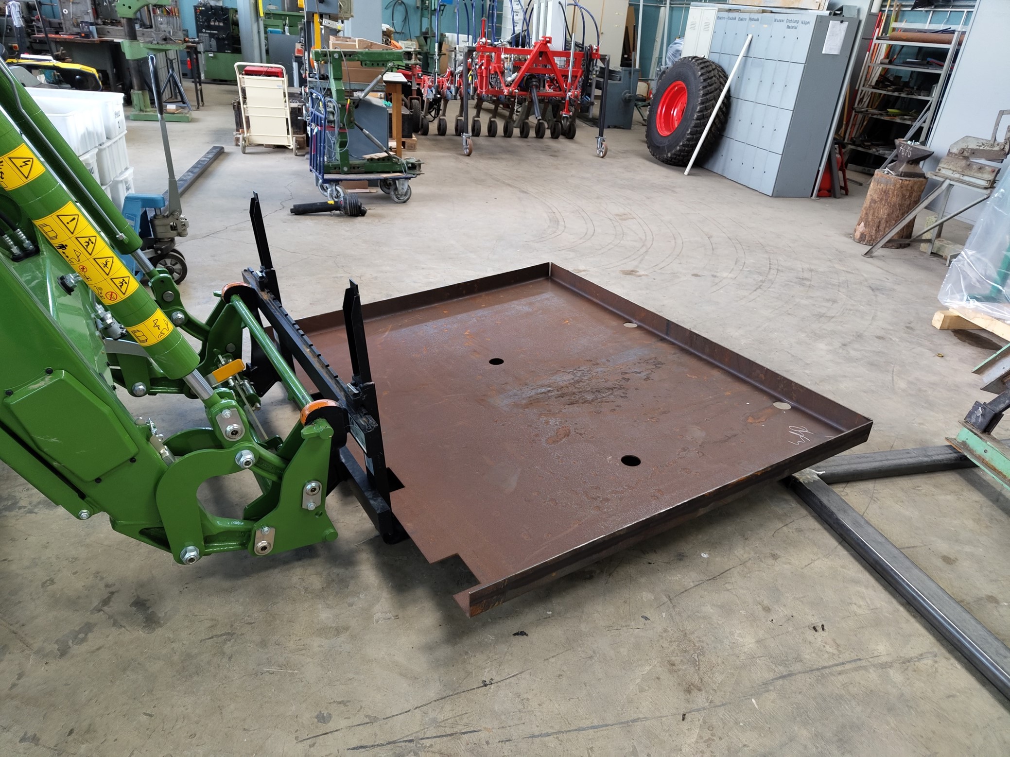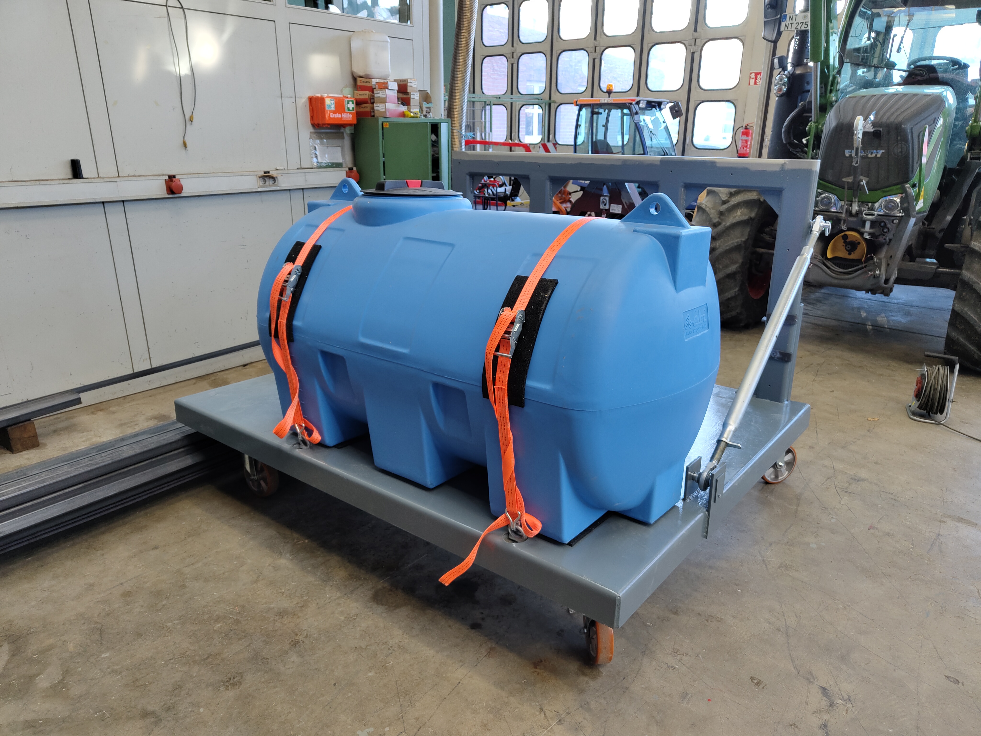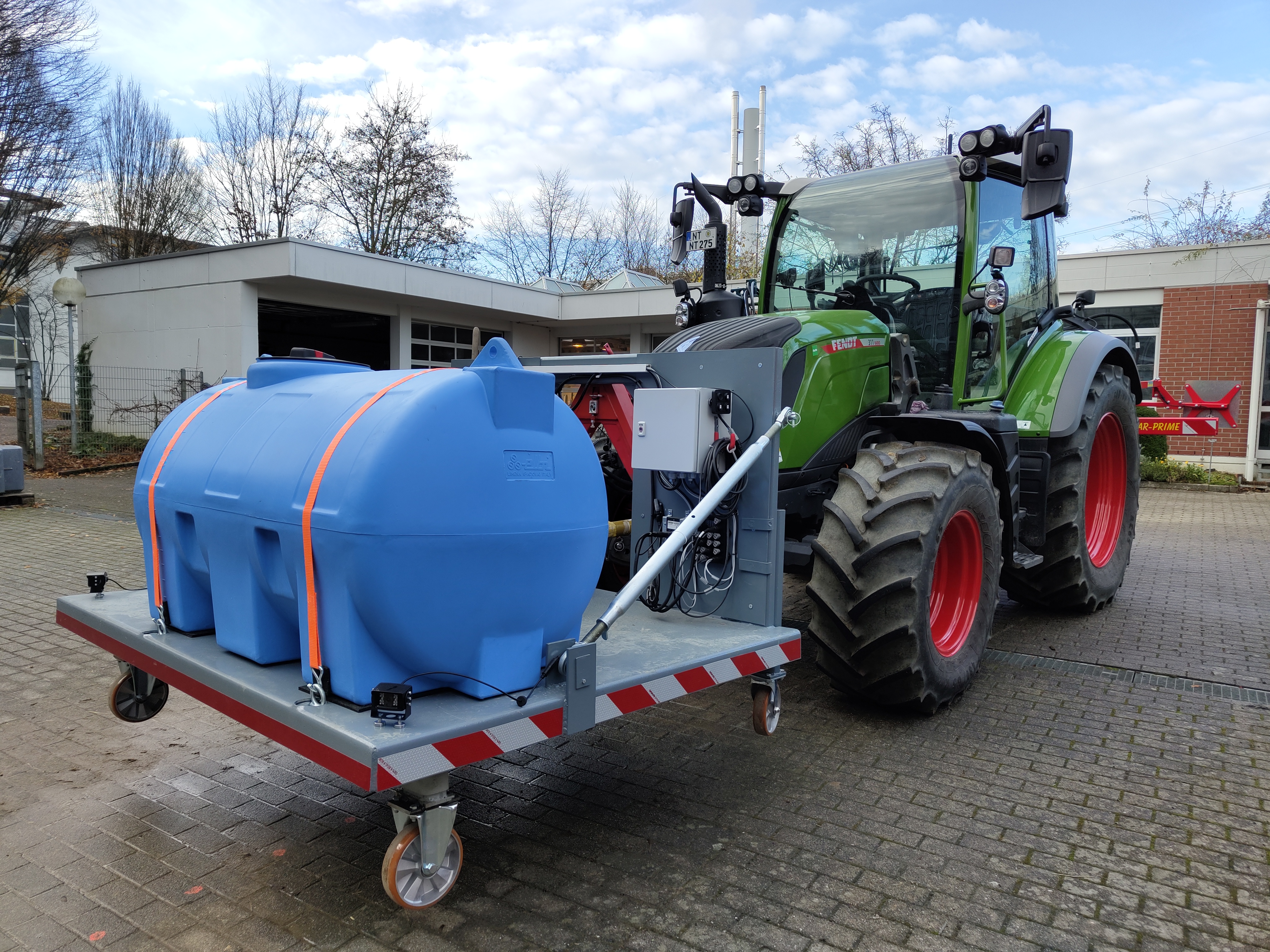 Damit alle Systemkomponenten auf dem Feld mitgeführt werden können, nutzt „SpoteeJet“ zwei Anbauräume am Traktor. Hinten wird der Verschieberahmen und die Hacktechnik mitgeführt und vorne die Hochdruckwasserpumpe, sowie ein Wassertank. Zum einfachen An- und Abbau wird der Frontrahmen über ein Weiste-Dreieck mit dem Traktor verbunden.