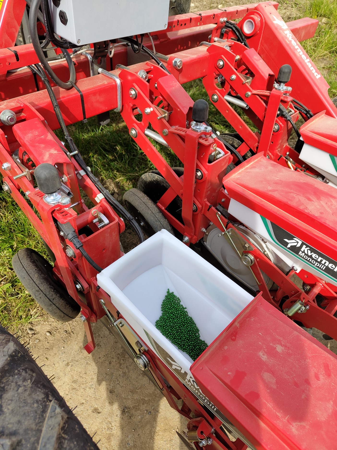 Am 30.05.2023 wurden die ersten Parzellen mit der Monopill gesät. Hierfür wurden zunächst vier verschiedene Bahnen ausgesät, mit jeweils unterschiedlichen Einstellungen an der Sämaschine. Die Reihenweite beträgt 45cm und in der Reihe wurde ein Pflanzenabstand von 25cm eingestellt.