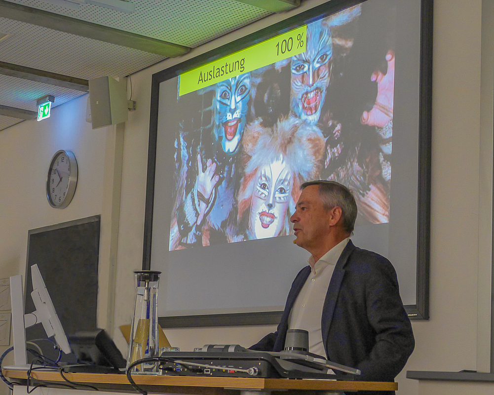 Auf der Bühne ist es der Glitzer und der Glamour, hinter den Kulissen zählt das Geld. „Es gab einen Zeitpunkt da waren an der Stella AG bis zu 50 verschiedene Investoren beteiligt, das ‚Phantom der Oper‘ wurde über einen 3-Länder-Fond finanziert“, dies berichtete Bernhard Kurz im Rahmen seines Vortrags, den die HfWU zusammen mit dem Rotary Club Nürtingen-Kirchheim/Teck organisiert hatte. Rund 70 Interessierte waren zu der Studium-generale-Veranstaltung an die Hochschule gekommen.