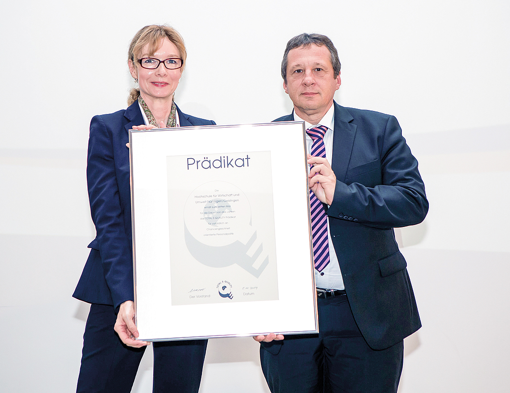 „Die Führungspersönlichkeiten unserer Prädikatsträger haben erkannt, dass gelebte und in der Organisation fest verankerte Chancengleichheit und Vielfalt zu mehr Erfolg führt. Sie präsentieren sich als zukunftsweisende Vorbilder in unserer Gesellschaft“, sagte Eva Maria Roer, Vorsitzende des Total E-Quality Deutschland e.V. bei der Prädikatsübergabe an die Hochschule für Wirtschaft und Umwelt Nürtingen-Geislingen (HfWU), vertreten durch den Rektor, Prof. Dr. Andreas Frey und die Gleichstellungsbeauftragte, Prof. Dr. Anka Reich. Die HfWU wurde als eine von 60 Organisationen aus Wirtschaft, Wissenschaft, Verwaltung und Verbänden bei einer bundesweiten Veranstaltung in München für ihre zukunftsorientierte, erfolgreiche und nachhaltige Personalpolitik ausgezeichnet.