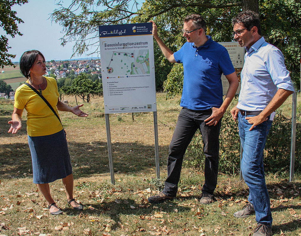 Nach der Eröffnung des Lehrpfads vor zwei Jahren ist das Thema Bienen, Imkerei und die damit verbundene Rolle der Landwirtschaft mittlerweile im Lehr- und Forschungsprogramm der HfWU etabliert. „Mit dem Bienenlehrpfad und den Bienenvölkern haben die Studierenden zudem die einzigartige Möglichkeit, hier auch praktische Erfahrungen zu sammeln. Wir vermitteln das Wissen nicht nur theoretisch im Hörsaal“, betont Agrarwirtschaftlerin Benz. Erst kürzlich hat die Wissenschaftlerin den Bienenlehrpfad zusammen mit Studierenden mit Infotafeln zum Thema Wildbienen ergänzt. Einen Beitrag zum Erhalt der Biodiversität leistet auch das jetzt neu von der HfWU und der ZinCo GmbH zusammen mit Verbänden, dem Landkreis und Kommunen gegründete Kompetenz-Zentrum Gebäudebegrünung und Stadtklima. Darauf wies HfWU-Rektor Frey hin.
