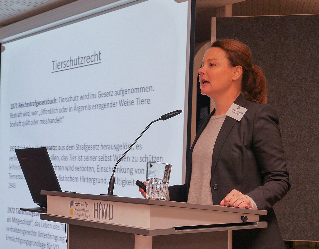 Das Team Nürtingen der Jungen Deutschen Landwirtschafts-Gesellschaft (DLG), ein Zusammenschluss von Studierenden an der HfWU, hatte zu der Veranstaltung eingeladen. Zu der Tagung unter dem Titel „Eingriffe an Nutztieren – wie lässt sich das Tierschutzgesetz integrieren“ waren rund 50 Interessierte gekommen.