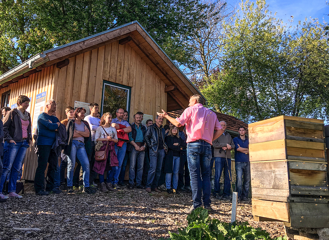 Alexander Guth, Referent vom Landesverband Württembergischer Imker, berichtete im Rahmen der Veranstaltung bei den Lehr- und Versuchsgärten der HfWU auf dem Hofgut Tachenhausen bei Oberboihingen über aktuelle Erkenntnisse zur Nahrungsversorgung, beim Pflanzenschutz, über die Bestäubungsleistung der Bienen und das Erkennen und korrekte Handeln bei Bienenschäden. Gekommen waren rund hunderte Interessierte, insbesondere auch aus der Landwirtschaft und der Imkerei. „Nicht jedes Bienensterben ist automatisch auf die Verwendung von Pflanzenschutzmitteln zurückzuführen“, erklärte Guth. Unsachgemäßes Vorgehen der Imker, die Varroa-Milbe oder die Überzüchtung der Völker, so die Erfahrung des Bienensachverständigen, seien ebenfalls oft Gründe für einen Rückgang der Bestände.