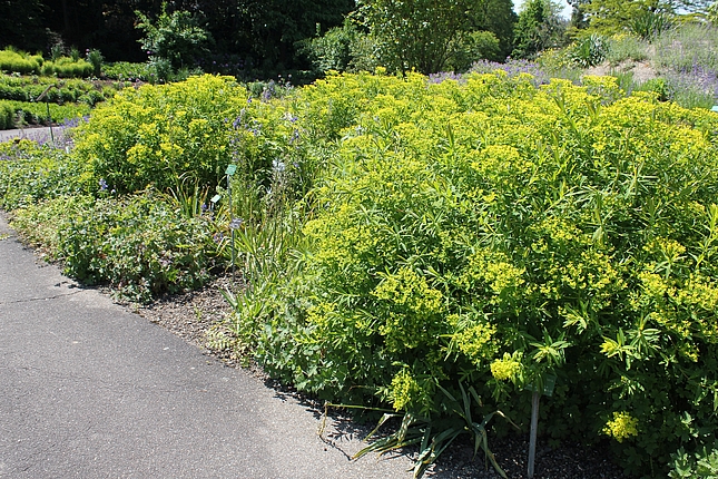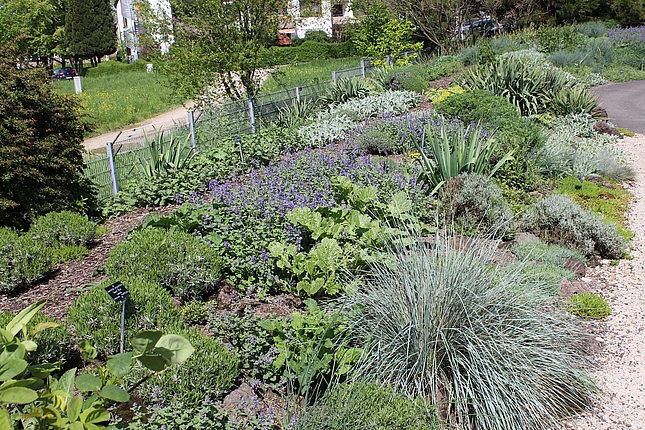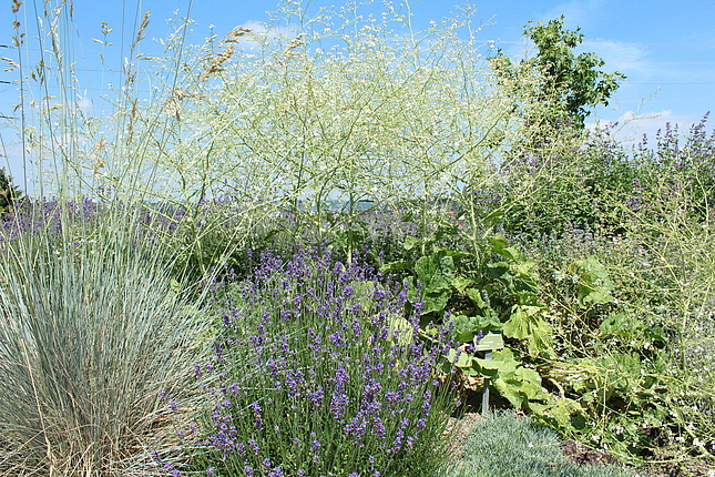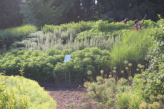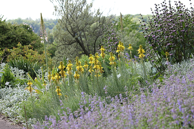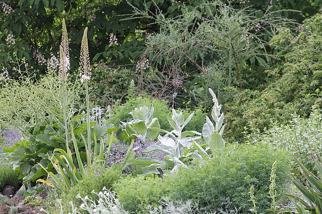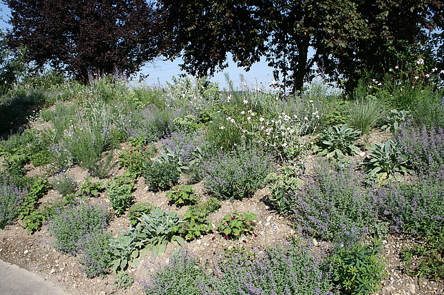 Diese Pflanzung ist geprägt durch verschiedenste Stauden und Kleingehölze mit grauem, filzigen, graublauen und/oder graugrünem Laub. Sie wird zu einer Leitstaudenpflanzung entwickelt.