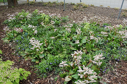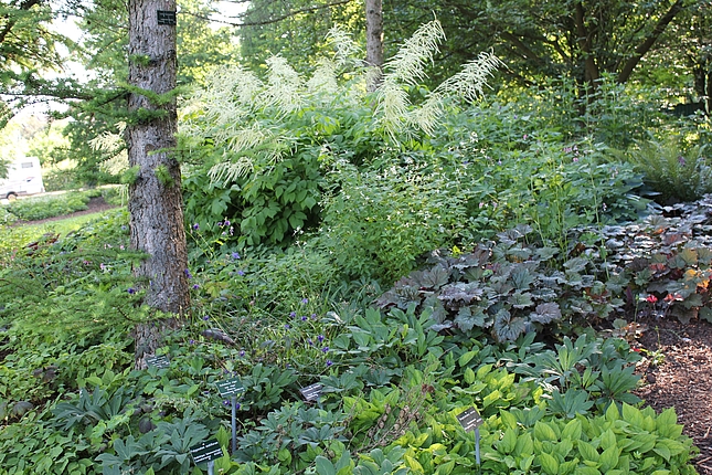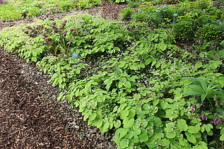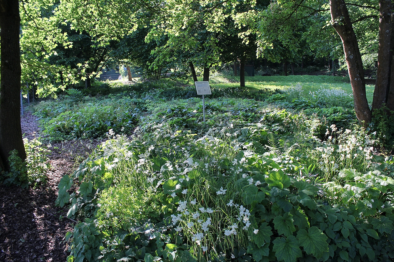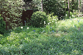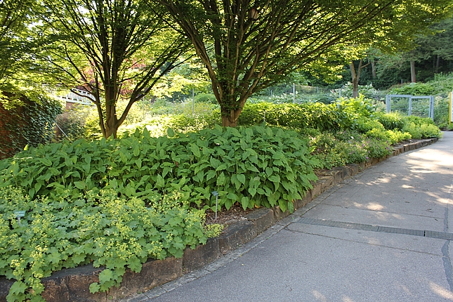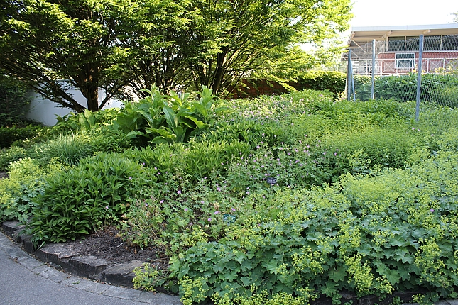 Direkt im Anschluss an den Hauptweg finden sich 4 sogenannte "Module für den trockenen Schatten". Es sind Mischpflanzungen auf jeweils einer quadratischer Grundfläche von 10 qm. Sie können bei Bedarf beliebig aneinandergereiht und dadurch für unterschiedlich große Flächen verwendet werden. Sie kommen mit wenigen Arten aus. Seit dem Jahr 2014 sind noch 4 weitere Module hinzugekommen, von denen 3 am Waldrand neben der Extensiven Schattenpflanzung aufgepflanzt sind.