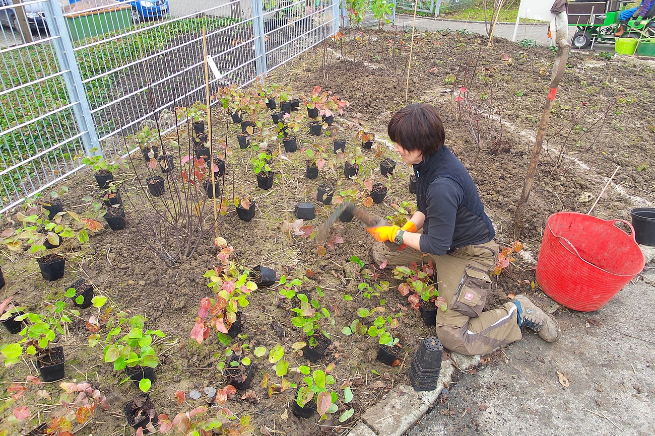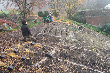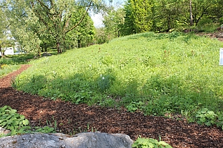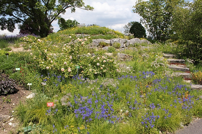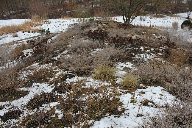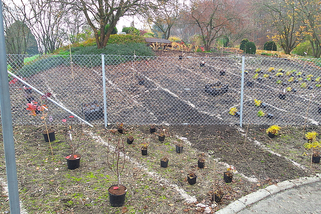 Auf dem dahinter liegenden Hügel entsteht demnächst eine Staudenmischpflanzung in Verbindung mit Rosen. Hier wird beobachtet, welche bodendeckenden Staudenarten sich in geeigneter Weise mit Strauchrosen kombinieren lassen. Auch diese Mischpflanzung wird einen einfachen Charakter haben und sehr pflegeextensiv sein. Durch die Rosen wirkt sie aber auf jeden Fall farbenprächtig und lange.