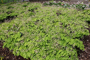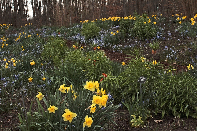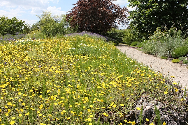 Pfingstrosen finden hier - eher ungewöhnlich - in einer Streupflanzung Verwendung. Sie werden in eine Matrix aus bodendeckenden Stauden locker eingestreut. Diese Matrix wurde nicht wie üblich aus einer Staudenart gestaltet, sondern aus Bändern verschiedener Arten, die vom Mittelpunkt des Hügels hinab zum Weg verlaufen. Diese Bodendecker sind relativ robust und wüchsig. Auch die Pfingstrosen haben zwar ausgesprochen prächtige Blüten, sind aber im Grunde sehr pflegeleicht. So ist das Ziel, eine prachtvolle und gleichzeitg pflegeextensive Staudenpflanzung zu entwickeln.