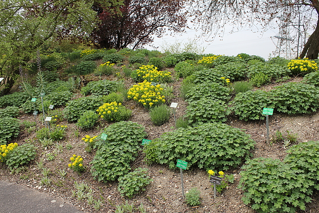 Außerhalb des Staudengartens ist links des Weges zur Mensa der Naturwerkstein-Lehrpfad zu finden. Hier werden die im Landschaftsbau gängigen Natursteine in ihrer Be- und Verarbeitung gezeigt.
