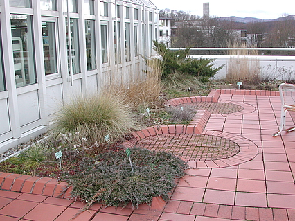 Begehbar  und als Dachterrasse mit Pflanzflächen ausgebildet ist nur das sogenannte "Westdach". Die roten Klinker, mit denen es belegt ist, nehmen den Farbton der Klinkerfassaden des Gebäudes auf.