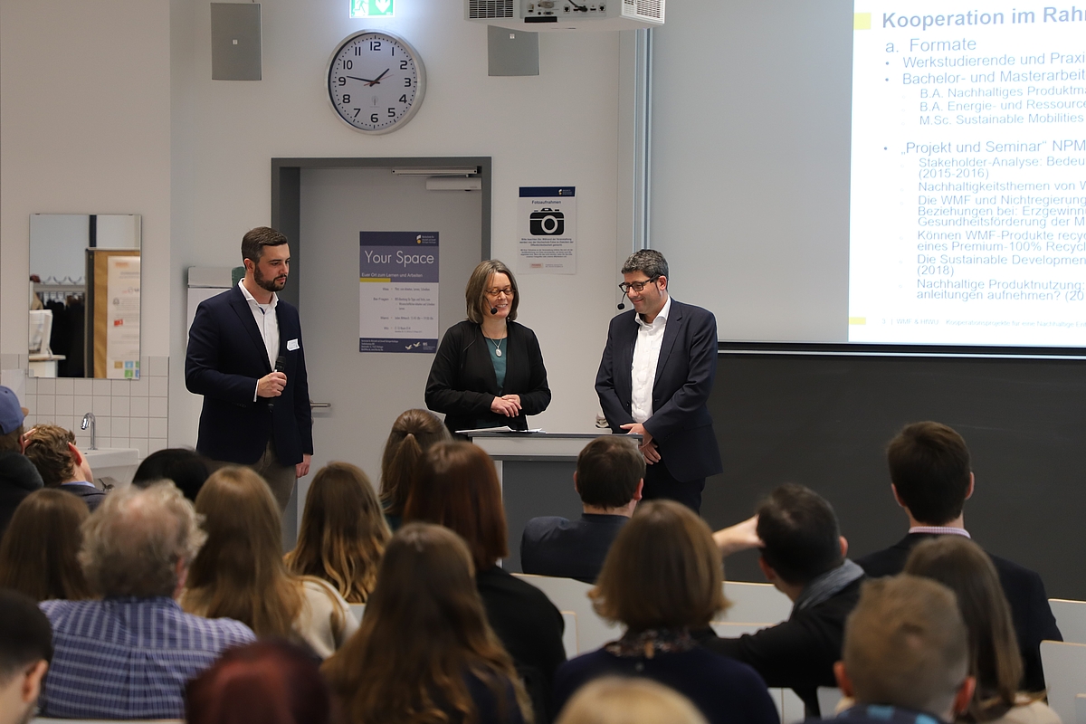 Den Auftat des Symposiums machte am 8. November die PHOENIX-Tagung, bei der unter dem Titel „Heute schon fit für morgen?! – Nachhaltige Entwicklung in Lehre und Praxis“ über Kompetenzen der Studiereden für einen Beitrag zur Nachhaltigen Entwicklung und deren Relevanz im späteren Berufsleben diskutiert wurde. Dass der Titel der Tagung auch Programm ist haben alle Teilnehmer/innen vor Ort erfahren, als Prof. Dr. Arnim Wiek (School of Sustainability, Arizona State University) der Tagung live aus den USA zugeschalte wurde und Einblicke in seine Forschung zu Schlüsselkompetenzen einer Nachhaltigen Entwicklung in der Hochschulbildung gab. Prof. Dr. Markus Frank (Professor für Agrarsysteme in der Zukunft, HfWU) ergänzte diesen Vortrag mit einem Impuls aus der Sicht von BASF, einem der größten DAX-Konzerne, bei dem er bis zu seiner Berufung an die HfWU tätig war. Prof. Dr. Biermann (Nachhaltiges Produktmanagement, HfWU) und Karsten Hiemesch (WMF Group GmbH) zeigten an konkreten Kooperationsprojekten in Lehrveranstaltungen auf, wie die Zusammenarbeit zwischen Firmen und dem Lehrbetrieb an der HfWU bereits heute gestaltet werden kann, damit die Studierenden die Bedeutung und Chancen für eine Nachhaltige Entwicklung an einem konkreten Projekt mit einem Praxispartner erleben können. Alle Teilnehmer/innen konnten ihr Wissen und Ihre Erfahrungen schließlich selbst an verschiedenen Thementischen im Format des Worldcafé diskutieren. Die Ergebnisse werden in Kürze auf der PHOENIX Website veröffentlicht.