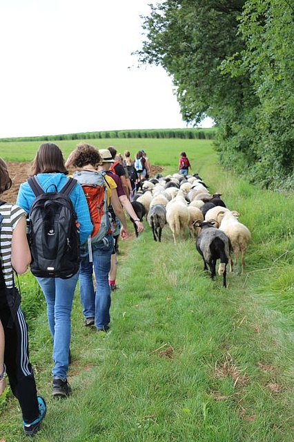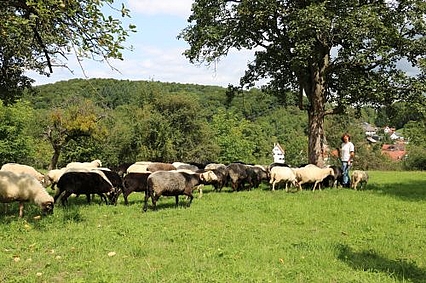 (Julia Menold u.a., Geschäftstelle Biosphärengebiet Schwäbische Alb) - Schafwanderung mit Waldschafen, Krainer Steinschafen und den Hütehündinnen Ronja und Emmi (Barbara Zeppenfeld, ArcheSchäferei)