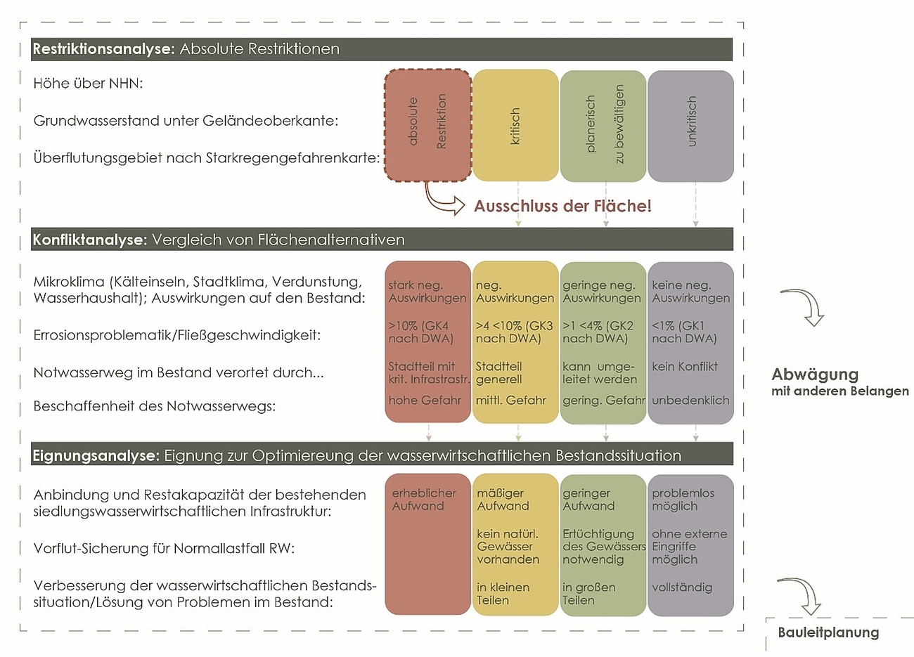 Bei der Bewertung von Potentialflächen stellt sich insbesondere die Frage an die Siedlungswasserwirtschaft, ob bzw. welche dieser Flächen absolute Restriktionen in Bezug auf Starkregenereignisse aufweisen und daher insbesondere für Siedlungs- und Verkehrszwecke ungeeignet sind.