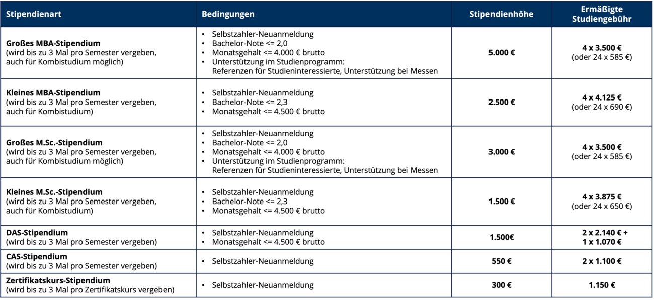 Das Digital Business Institute Stipendium dient der Förderung selbstzahlender Studierender und Teilnehmender im Digital-Master- & Studienprogramm der Digital Business School an der HfWU. Insbesondere sollen Teilnehmende mit sehr hoher Studienmotivation, noch nicht so hohem Einkommen und/oder mit entsprechend guten akademischen Vorleistungen unterstützt werden. Jedes Semester werden bis zu drei Teilstipendien pro Abschlussart vergeben: Master of Business Administration (MBA), Diploma of Advanced Studies (DAS), Certificate of Advanced Studies (CAS) und Zertifikatsstudium. Für das Kombistudium (Diploma und MBA) können analog das kleine oder große MBA-Stipendium verliehen werden.
