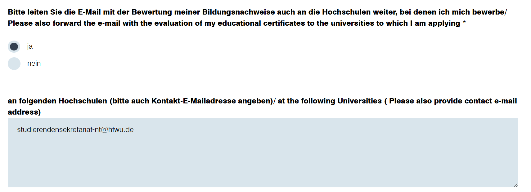 Second step: Upload all necessary documents to Selma (e.g. bachelor certificate, proof of English proficiency, motivation letter). Important: International applicants who received their former degree abroad have to get it first recognized by the Studienkolleg Konstanz . This recognition can be requested throughout the year. Important for speeding up the process with the Studienkolleg Konstanz: When completing your application form for the recognition of your certificate, please include our university as shown in this example.