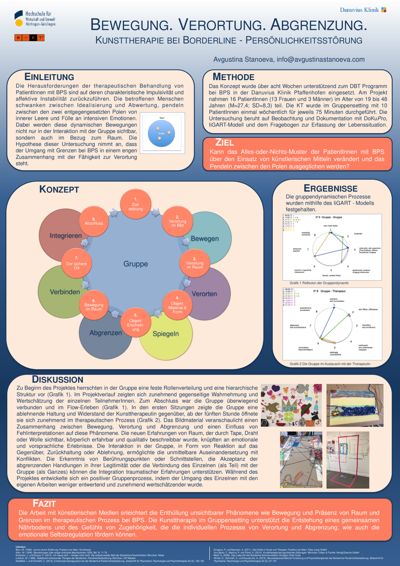 Im Rahmen dieser Mixed-Methods-Studie (QUAL + QUAN) wurden Kunsttherapeut*innen mit langjähriger (mind. 4 J.) Berufserfahrung befragt (n=4). Die Datenerhebung erfolgte durch strukturierte Expert*inneninterviews sowie einem studienspezifisch entwickelten und pilotierten Fragebogens über einen Zeitraum von 7 Monaten. Die Auswertung erfolgte anhand der qualitativen Inhaltsanalyse (nach Mayring) sowie deskriptiver Analysen von Häufigkeiten und Zusammenhängen durch Chi-Quadrat-Unabhängigkeitstest und Spearman-Rangkorrelations- koeffizient.