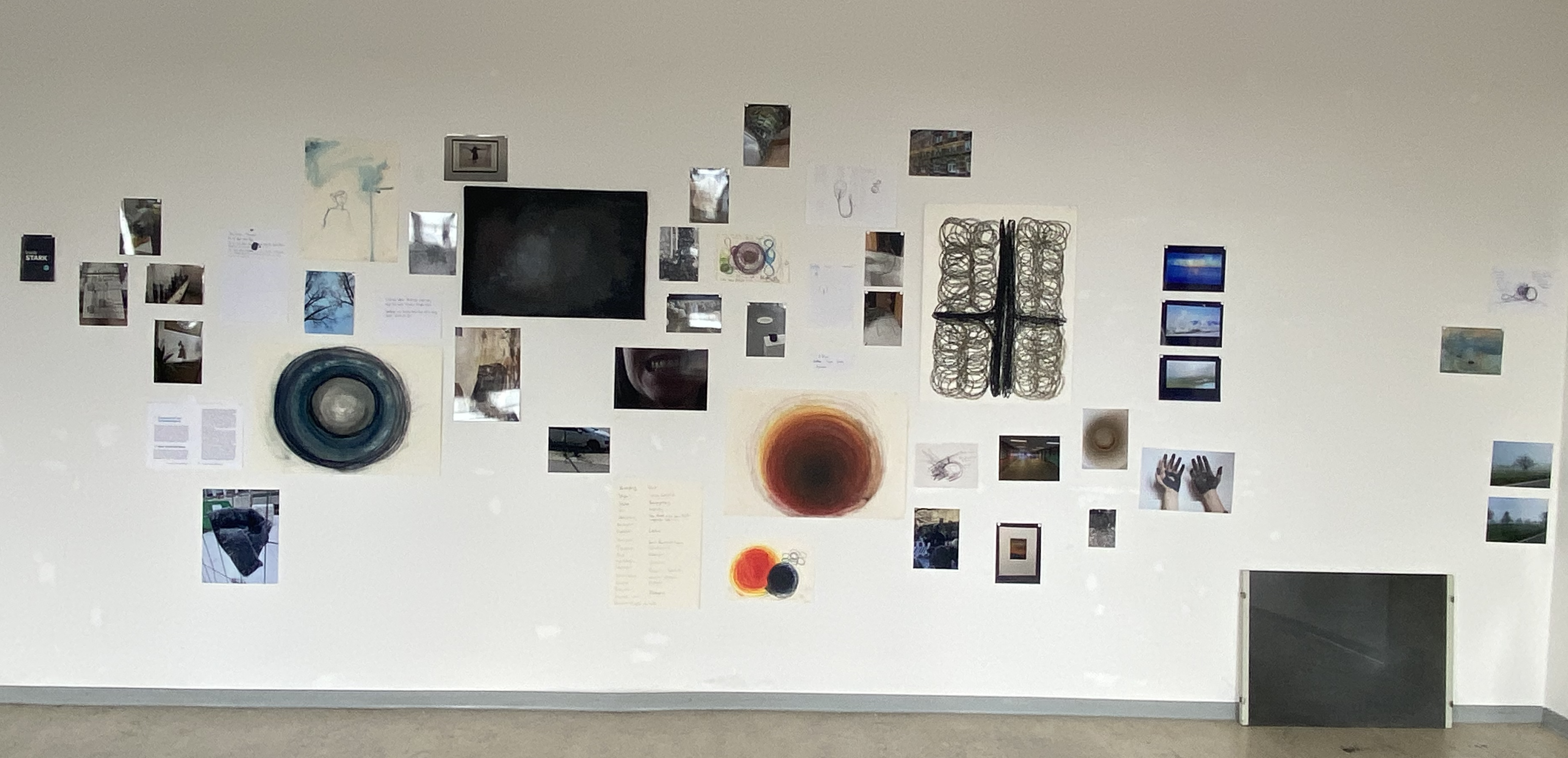 Vereinfacht gesagt ist eine persönliche Krise eine Phase im Leben eines Menschen, in dem bekannte Verhaltensmuster nicht mehr ausreichend sind, um ein Problem zu bewältigen. Es finden eine oder mehrere Veränderungen im Äußeren oder Inneren des Menschen statt, die eine Störung der normalen Abläufe auslösen. Diese Irritation beinhaltet zugleich eine Chance, im Idealfall wird sie ergriffen und führt zu einer Veränderung mit positiven Auswirkungen – beispielsweise eine Weiterentwicklung des Menschen. Gefühle, Körpererfahrungen und Gedankenzustände werden in den Krisenphasen oft als extrem wahrgenommen und lassen sich teilweise schwer zuordnen. Ich habe diese Zustände der Unsicherheit, Trauer, Wut und Leere in Bezug auf meine eigene persönliche Krise untersucht, indem ich sie wahrgenommen und bildnerisch dargestellt habe. Als Hauptmedien nutzte ich Pastellkreide auf Papier und ausgedruckte Fotografien von Alltagsentdeckungen, die diese Erfahrungen repräsentieren. Bezüge zu vorherigen handwerklichen Arbeiten und zu künstlerischen Arbeiten anderer Menschen, sowie theoretische Konzepte erweitern meine künstlerische Forschung. Die Abbildungen zeigen die Zusammenstellung der Arbeiten im Rahmen des Kolloquiums. Auf der linken Wand ist die Krise in ihrer dunklen und schweren Seite zu sehen. An der Ecke geht sie über in die Seite der Chance, der Entwicklung und des Neubeginns auf der rechten Wand.