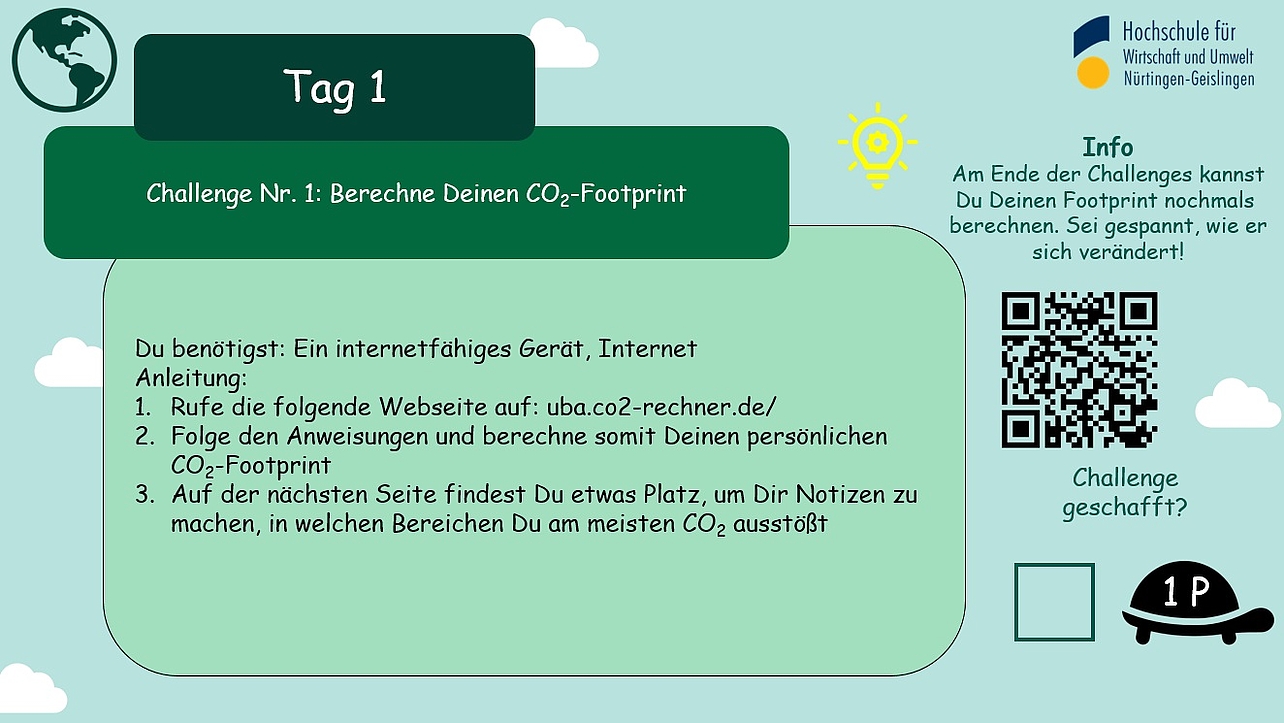 Im Rahmen des Moduls „Projekt und Seminar“ der Studiengänge Energie- und Ressourcenmanagement und Nachhaltiges Produktmanagement haben die Studierenden Marion Breuer, Jana Bühler, Timo Deigner, Simon Grosdanow, Max Gugenhan, Mieke Jongmans und Julia Wildermuth unter der Betreuung von Prof. Dr. Marc Ringel eine Klima-Challenge entwickelt mit dem Ziel aufzuzeigen, was individuelle Klimaschutzbeiträge leisten können. Die Entwicklung der Challenges erfolgte in Zusammenarbeit mit Markus Szaguhn (KIT) und Johannes Fuchs (HfWU-PHOENIX) unter der Schirmherrschaft des Europäischen Klimapakts.