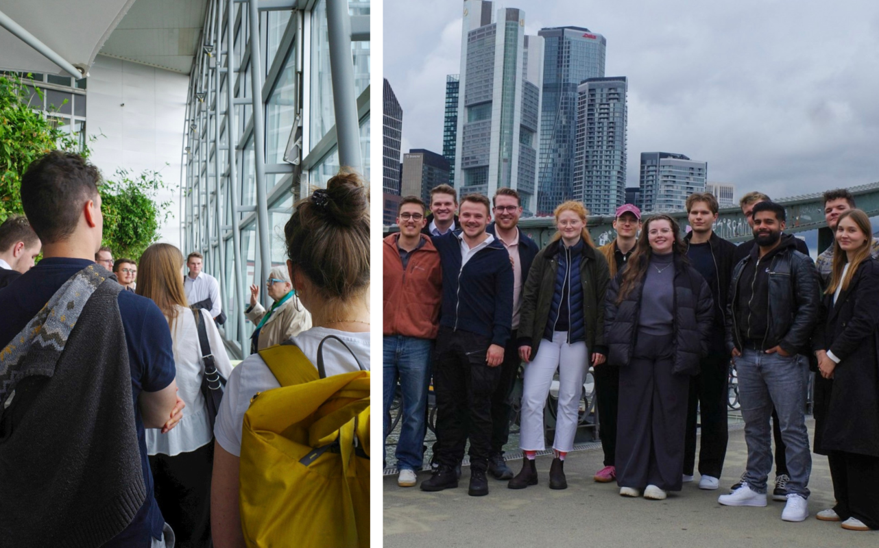 Ein Highlight der zweitägigen Exkursion war der Besuch im Commerzbank Tower. Dort führte Felix Liptak, ehemaliger Studierender des Vorgängerstudiengangs und heute Vice President Corporate Asset Sales bei der Commerzbank AG, die Gruppe durch den Handelssaal und gab spannende Einblicke in die Arbeit der Bank sowie in vielfältige Berufsbilder im Finanzsektor.