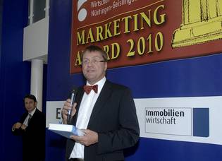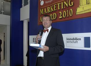 Der Gewinner in der Kategorie Lower/Small-Budget-Award Helmut Ecklkofer (links), Geschäftsführer der CITY BAU GmbH (mitte), Laudator Volker Wohlfahrtvon der Immobilien Scout GmbH und Prof. Stephan Kippes