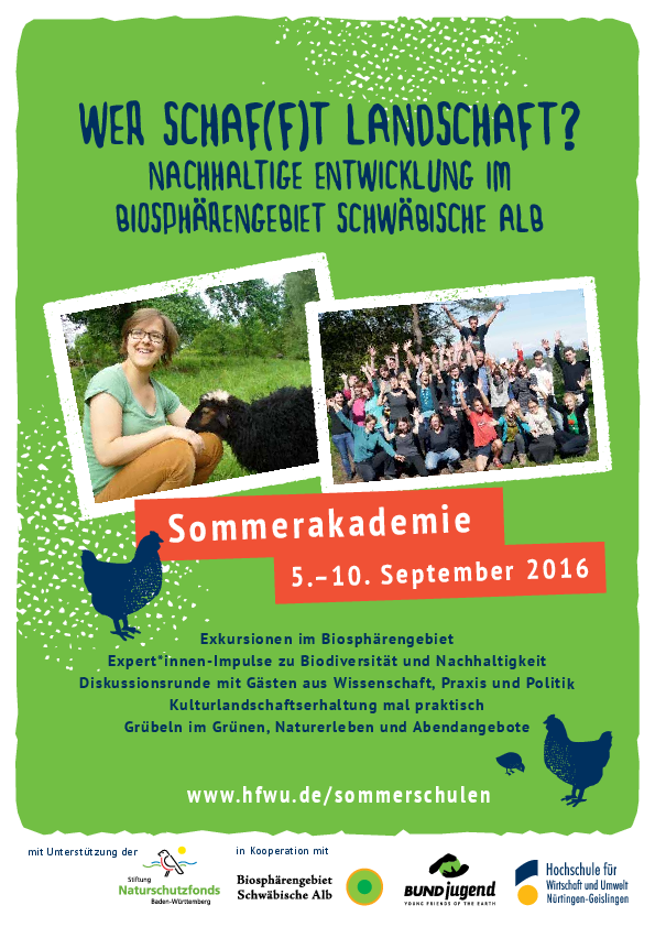 2016 ging es unter dem Titel »Wer schaf(f)t Landschaft?« darum, wie Natur- und Kulturlandschaften erhalten und nachhaltig bewirtschaftet werden können – insbesondere durch extensive Beweidung, z.B. mit bedrohten Schafrassen. Nebenbei erfuhren die TeilnehmerInnen aber auch viel über Biosphärenreservate und über Artenvielfalt, und außerdem setzten sie sich kritisch mit dem Konzept der Nachhaltigen Entwicklung auseinander.