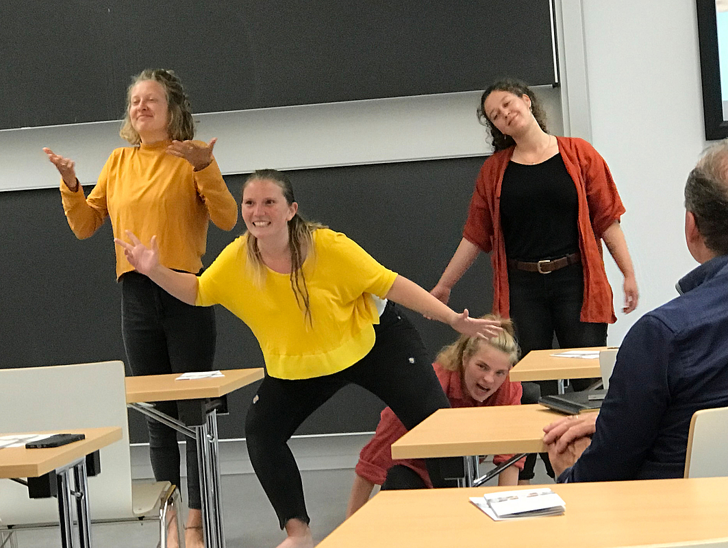 Im Anschluss an die Ausführungen stellte sich die HfWU-Awareness-Gruppe vor, die sich für eine Sensibilisierung bei Diskriminierungsthemen einsetzt. Anschließend führten Studierende der Theatertherapie ein spontanes „Playbacktheater“ auf. Das Publikum wurde wiederholt nach seinen Gefühlen vor dem Hintergrund des Vortrags gefragt, die Theatergruppe stellte die Antworten dar: Inspiration, Spannung, Wut, Betroffenheit, Hoffnung. Zum Schluss war noch Zeit für Fragen und Austausch mit der Referentin. Mit auf den Weg gab Singirankabo den Besucherinnen und Besuchern den Rat: Zurst eine Verbindung mit den Menschen schaffen, erst dann mache es Sinn, nach der Herkunft und anderem zu fragen und nicht umgekehrt. Als Schlusswort zitierte sie ein Sprichwort der Lakota-Indianer: „Ein Kind ist jedes Kind, eine Frau ist jede Frau, ein Mann ist jeder Mann. Was wir für einen tun, kommt allen zugute.“ Langer Applaus.
