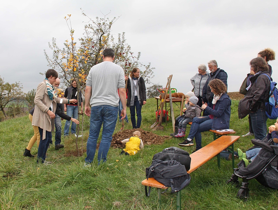 NÜRTINGEN(hfwu). Mit den neuen Babys kommt jedes Jahr auch ein neuer Apfelbaum hinzu. Die frischgebackenen Eltern und Vertreter:innen der Hochschule für Wirtschaft und Umwelt Nürtingen-Geislingen (HfWU) haben auf den Streuobstwiesen des HfWU-Lehr- und Versuchsbetriebs bei Tachenhausen einen neuen Paten-Apfelbaum gepflanzt. Er ist dem Nachwuchs gewidmet, der im jeweiligen Jahr in Familien von HfWU-Mitgliedern geboren wurde.