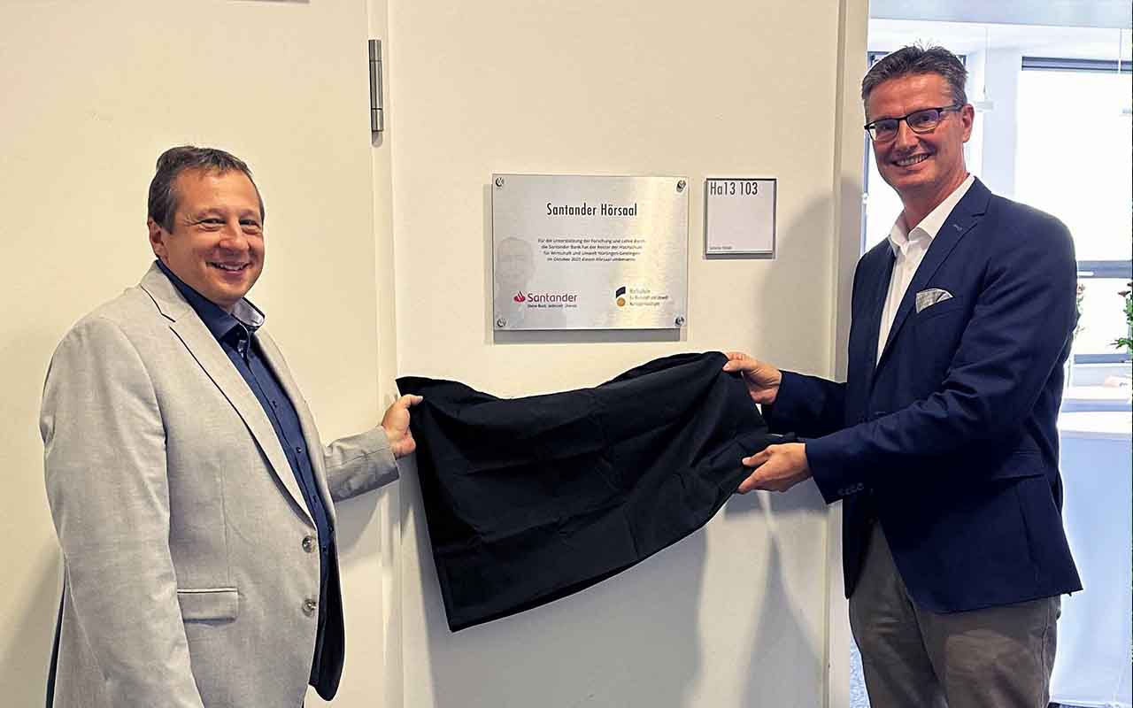 „Für die Unterstützung der Forschung und Lehre durch die Santander Bank hat der Rektor der Hochschule für Wirtschaft und Umwelt Nürtingen-Geislingen im Oktober 2023 diesen Hörsaal umbenannt“ – dieser Satz ist nun auf dem neuen Raumschild des Hörsaals zu lesen.