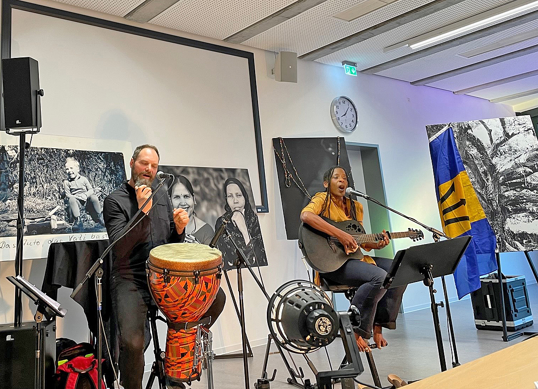 In Abwechslung zu den Liedern seiner Frau gab Depuhl Geschichten aus der gemeinsamen Autobiografie wider. Und wie im Buch stehen an diesem Abend nicht nur die dunklen Seiten im Vordergrund, sondern vor allem auch Hoffnung, Vielfalt, die offene Begegnung und das Feiern der Lebensfreude. Bailey, berichtet Depuhl, wurde in London geboren, studierte dort später, wuchs aber in Barbados auf. Ihre Familiengeschichte geht zurück bis in 19. Jahrhundert. Seit damals kamen über 400.000 Sklaven aus Afrika auf die karibische Insel. „Damals waren wir Sklaven, heute sind wir frei“, beschreibt Bailey das Gefühl auf Barbados zu leben – was für sie nach wie vor Heimat bedeutet.