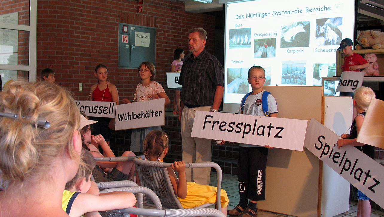 Die Schweine in Reudern leben teilweise in richtigen Wohnungen. Sie haben ein Wohnzimmer mit einem Scheuerpfahl, ein Kinderzimmer mit einem Karussell, ein Esszimmer mit einem Wühlbehälter und einer Tränke, ein Bad mit einer Dusche und eine mit einem Vorhang abgetrennte Toilette. „Ich kann euch sagen: Darin fühlen sie sich sauwohl“, meinte Professor Schwarting, der mit seinem Team vor einigen Jahren das „Nürtinger System“ entwickelt hat, das den Schweinen ein Zuhause gibt.