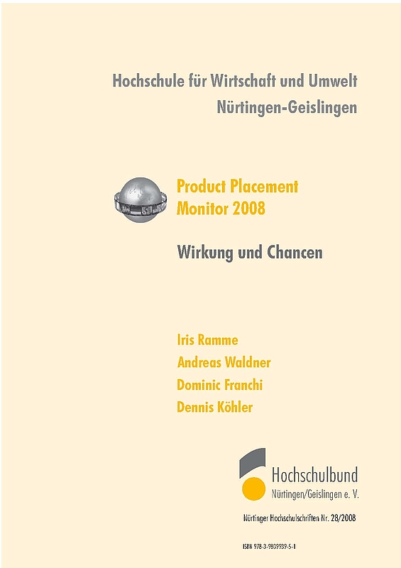 Der Product Placement Monitor 2008 erscheint neu in der Schriftenreihe im Hochschulbund Nürtingen/Geislingen, Nr. 28 ISBN 978-3-9809939-5-1 und kann über www.waldner.tv bezogen werden.