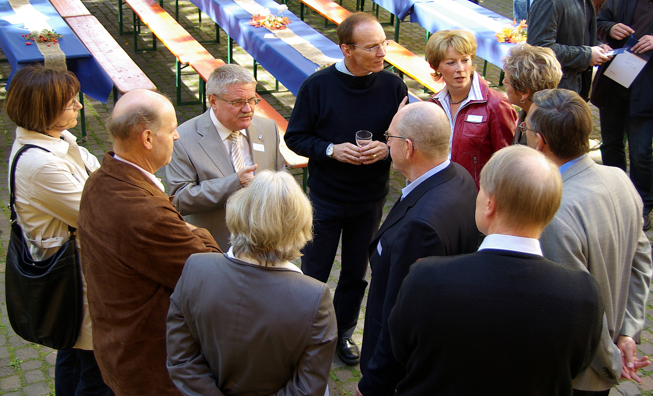 Glücklicherweise zeigte sich das Wetter am vergangenen Samstag von seiner freundlichen Seite, so dass ein Teil der Veranstaltung im herbstlich geschmückten Innenhof des Nürtinger Campus stattfinden konnte. Nachdem sich die Alumni am Sektempfang mit einer kleinen Erfrischung eingedeckt hatten, begrüßte Rektor Prof. Dr. Werner Ziegler die Gäste und informierte die Anwesenden über die Entwicklungen an der HFWU. Manch einer der Ehemaligen zeigte sich erstaunt darüber, dass aus einst drei Studiengängen inzwischen 24 geworden sind. Rektor Ziegler betonte die Bedeutung der Alumniarbeit und freute sich über die 80 Anwesenden – unter ihnen einige, die schon seit über zehn Jahren nicht mehr in Nürtingen gewesen sind.