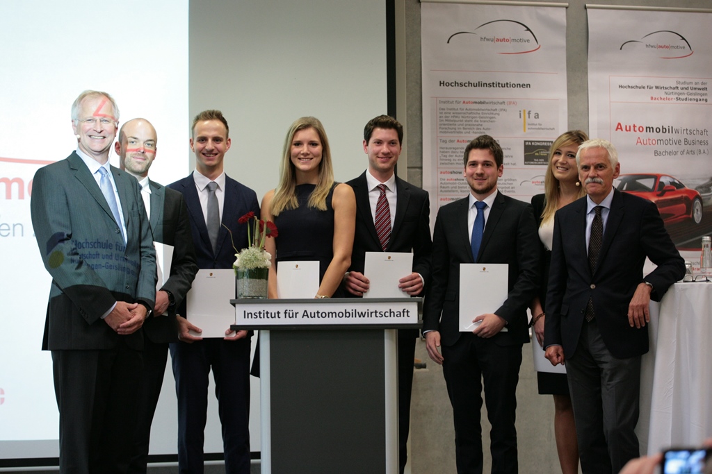 Wenngleich „trockene“ betriebswirtschaftliche Prozesse bei Porsche immer im Blickfeld bleiben, lässt sich nicht verleugnen, dass es bei der Marke ebenso um „Emotion pur“ geht. Eine Faszination, der sich auch die Hochschule für Wirtschaft und Umwelt nicht entziehen kann. Professor Dr. Willi Diez hatte in seiner Begrüßung darauf hingewiesen, wie eng die Verbindung der automobilwirtschaftlichen Studiengänge mit dem Sportwagenbauer ist : „ … nicht nur über den Fuhrpark der Professoren“. Tatsächlich war der Auftritt für Puttfarcken fast ein Heimspiel: 24 Studierende durchliefen bislang das Stipendien- und Förderprogramm des Porsche Automotive Campus (PAC) an der HfWU. Im Anschluss an seinen Vortrag übergab Puttfarcken sechs weitere Stipendienurkunden. Viele der Stipendiaten sind zwischenzeitlich bei Porsche fest angestellt, auch einer der gestrigen Stipendiaten wird im Herbst in Zuffenhausen sein Arbeitsleben starten. Puttfarckens Vorgänger im Amt, Klaus Zellmer, und sein heutiger Assistent, Mark Klümper, sind ebenfalls Geislinger Absolventen. „Sie sehen, wir sind hier sehr gut vernetzt“, kommentierte Dr. Diez.