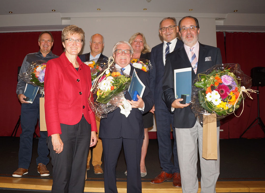 Foto (Aalener Zeitung/E. Hügler): Prof. Dr. Werner Ziegler (vorne Mitte), der ehemalige Rektor der Hochschule für Wirtschaft und Umwelt Nürtingen-Geislingen (HfWU), ist vom Verband baden-württembergischer Wohnungsunternehmen geehrt worden. Links die Verbandsdirektorin Iris Beuerle.