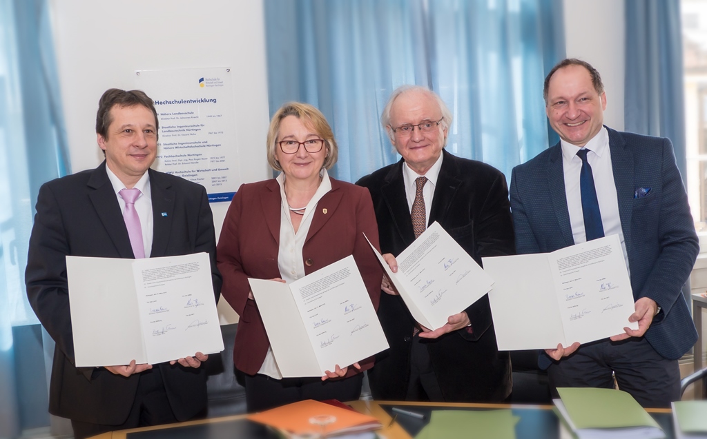 Foto (HfWU/cm): Die Integration der Hochschule für Kunsttherapie in die Hochschule für Wirtschaft und Umwelt ist besiegelt: HfWU-Rektor Prof. Dr. Andreas Frey, Wissenschaftsministerin Theresia Bauer, der Stiftungsratsvorsitzende Professor Jürgen Thies und HKT-Rektor Professor Johannes Junker.
