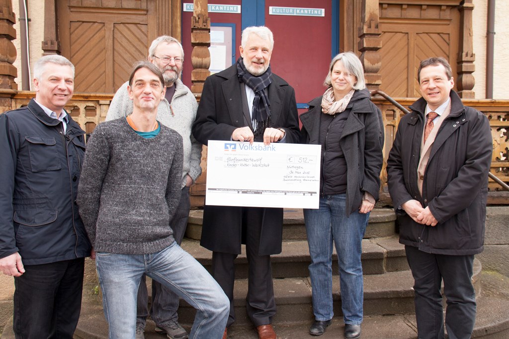 Tim Leberecht hatte auf sein Honorar verzichtet und die Einnahmen in Höhe von 512 Euro kamen nun vollständig der Kinderkulturwerkstatt zu Gute. Oberbürgermeister Otmar Heirich (Mitte), als Vorsitzender des Hochschulbundes, übergab mit Ursula Recke vom Buchhaus Zimmermann (2.v.r.) am Montag, dem 30.03.2015 den Scheck. Mit im Bild: Bernd Seefeld (links), Schatzmeister, und Pit Lohse, Geschäftsführer des Trägervereins Freies Kinderhaus(2. Reihe,2. V. l.). Der Rektor der Hochschule für Wirtschaft und Umwelt Nürtingen-Geislingen (HfWU), Professor Dr. Andreas Frey (rechts), und Thomas Butler, Leiter der Kinderkulturwerkstatt (2.v.l.).