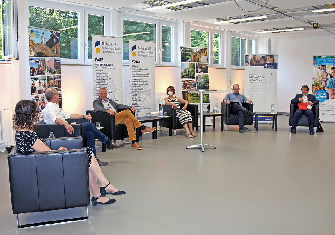 Das Interesse an der online durchgeführten englischsprachigen Veranstaltung war immens: rund hundert Teilnehmer*innen aus Ländern rund um den Globus waren bei der live Übertragung aus der „Future.Box“ dabei, dem neuen Gründerzentrum der HfWU in Nürtingen.