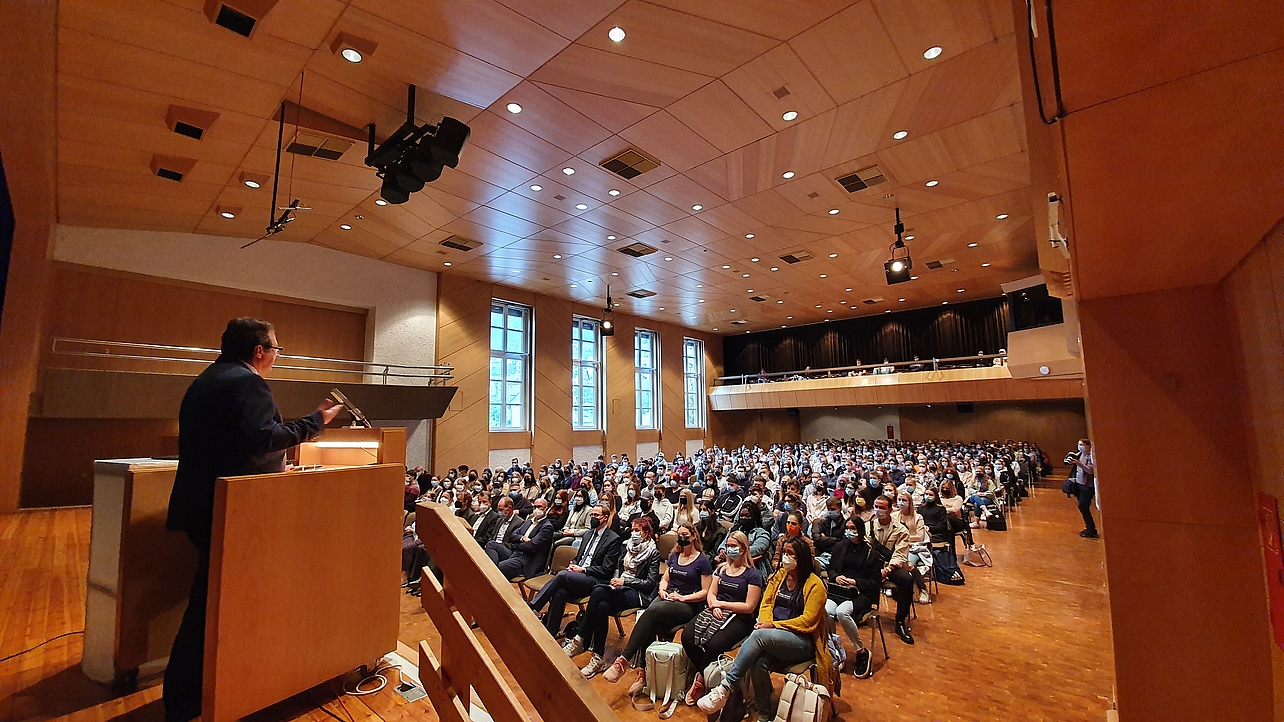 Nach drei digitalen Semestern kehrt das Leben auf den Campus zurück. Die Maßgabe der HfWU für das Wintersemester lautet „Präsenz“. Mit einem umfassenden Hygienekonzept und einem entsprechend größeren organisatorischen Aufwand ermöglicht die Hochschule den Lehrbetrieb vor Ort. Den Auftakt machten die Semestereröffnungsfeiern in der Nürtinger Stadthalle und der Geislinger Jahnhalle. Der HfWU-Rektor Prof. Dr. Andreas Frey begrüßte die Neulinge in Nürtingen zusammen mit OB Dr. Johannes Fridrich und in Geislingen mit OB Frank Dehmer. Im Anschluss an die feierliche Semestereröffnung standen die Einführungen in die verschiedenen Studienfächer auf dem Programm.