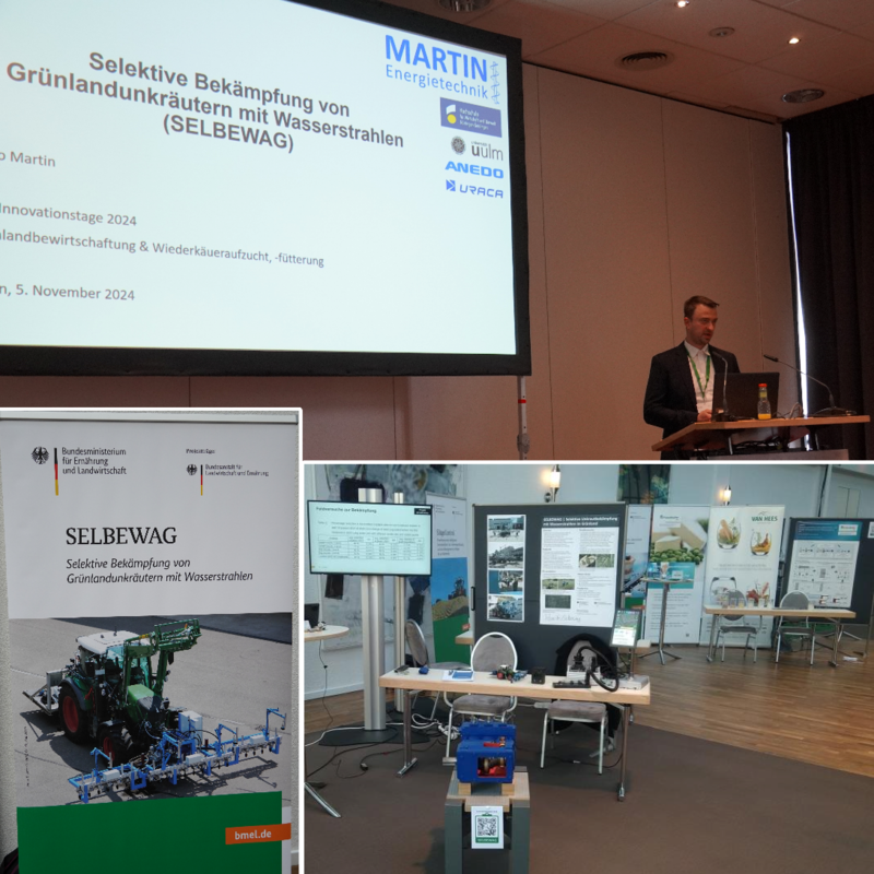 Die Gruppe um das vom Bundesamt für Ernährung und Landwirtschaft geförderte Projekt SELBEWAG * wurde dazu eingeladen, Ergebnisse und Projekttätigkeiten auf der Tagung vorzustellen. Der eigene Stand im Forum war Anlaufstelle für Informationen aus erster Hand für Teilnehmende aus Wirtschaft, Politik und Wissenschaft. Mit Exponaten rund um die Gerätetechnik sowie der Präsentation in digitaler und analoger Form wurde das Thema anschaulich dargeboten. Zusätzlich wurde durch einen Vortrag in der Session zur Grünlandbewirtschaftung das Projekt vorgestellt. Die Veranstaltung war eine gute Möglichkeit zur breiten Vernetzung der Akteurinnen und Akteure aus Wirtschaft, Wissenschaft und Politik und gab einen breitgefächerten Einblick in die zukunftsweisenden Projekte aus der Innovationsförderung des BMEL.
