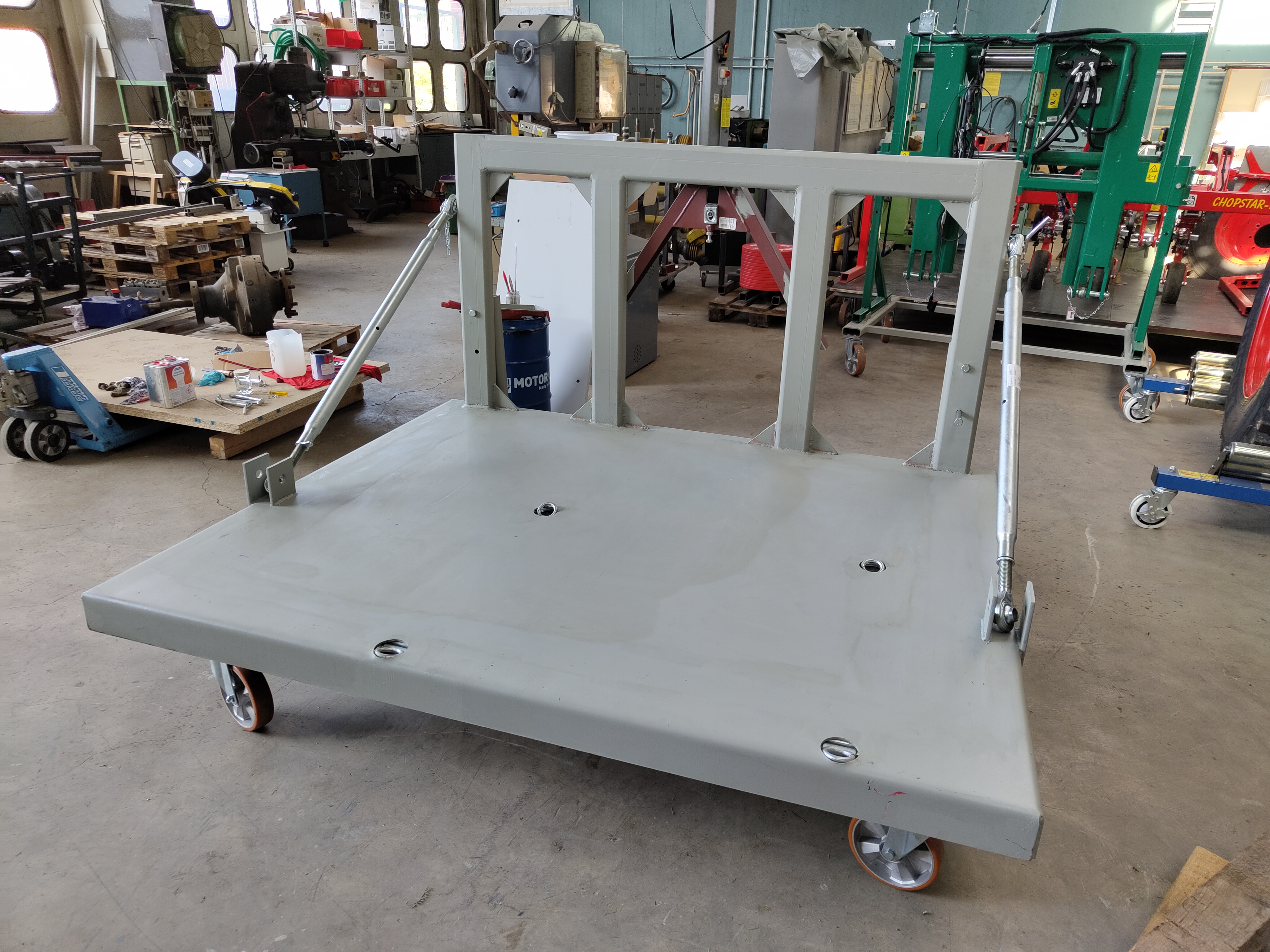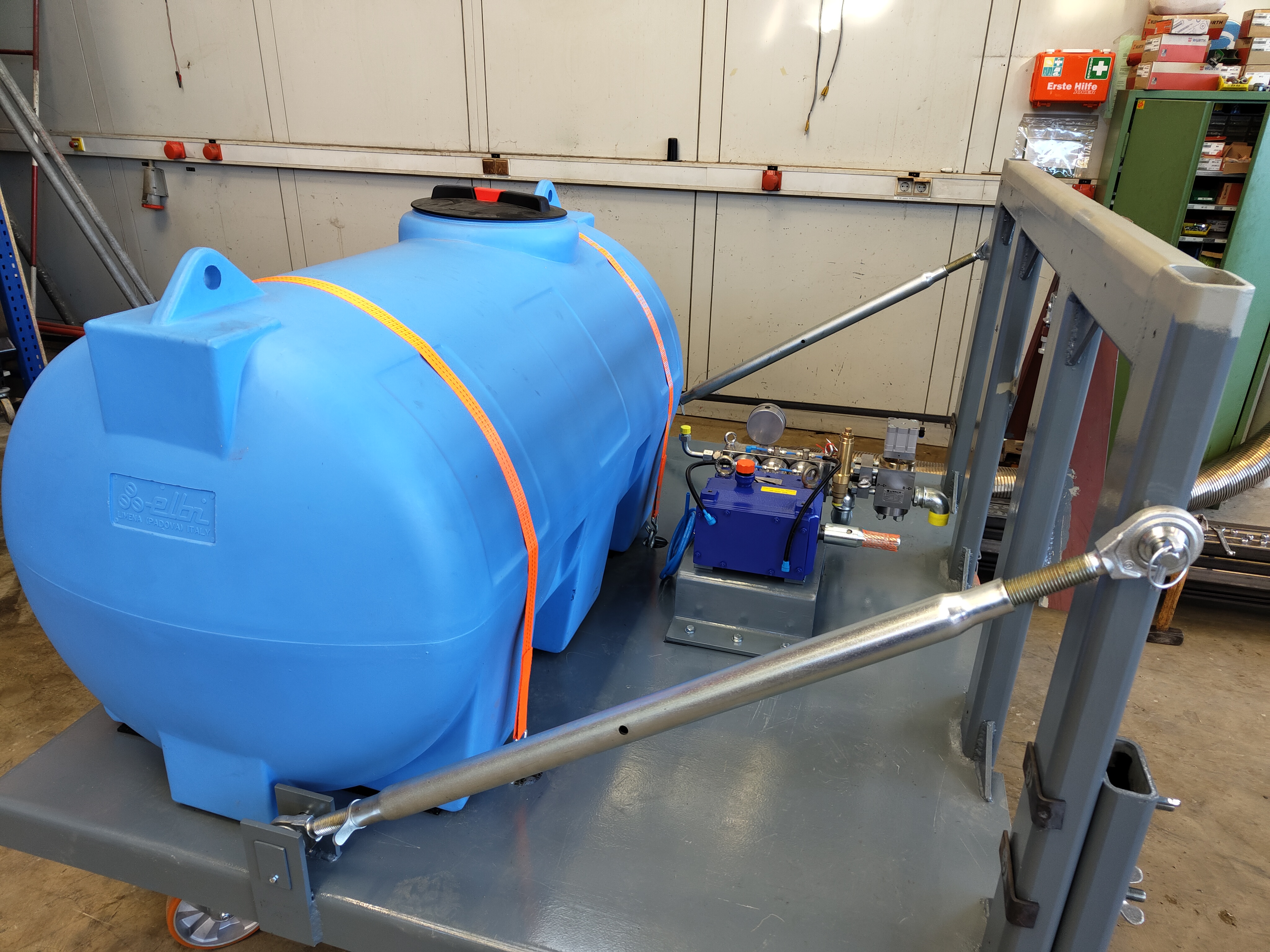 Damit alle Systemkomponenten auf dem Feld mitgeführt werden können, nutzt „SpoteeJet“ zwei Anbauräume am Traktor. Hinten wird der Verschieberahmen und die Hacktechnik mitgeführt und vorne die Hochdruckwasserpumpe, sowie ein Wassertank. Zum einfachen An- und Abbau wird der Frontrahmen über ein Weiste-Dreieck mit dem Traktor verbunden.